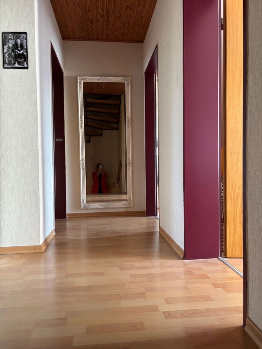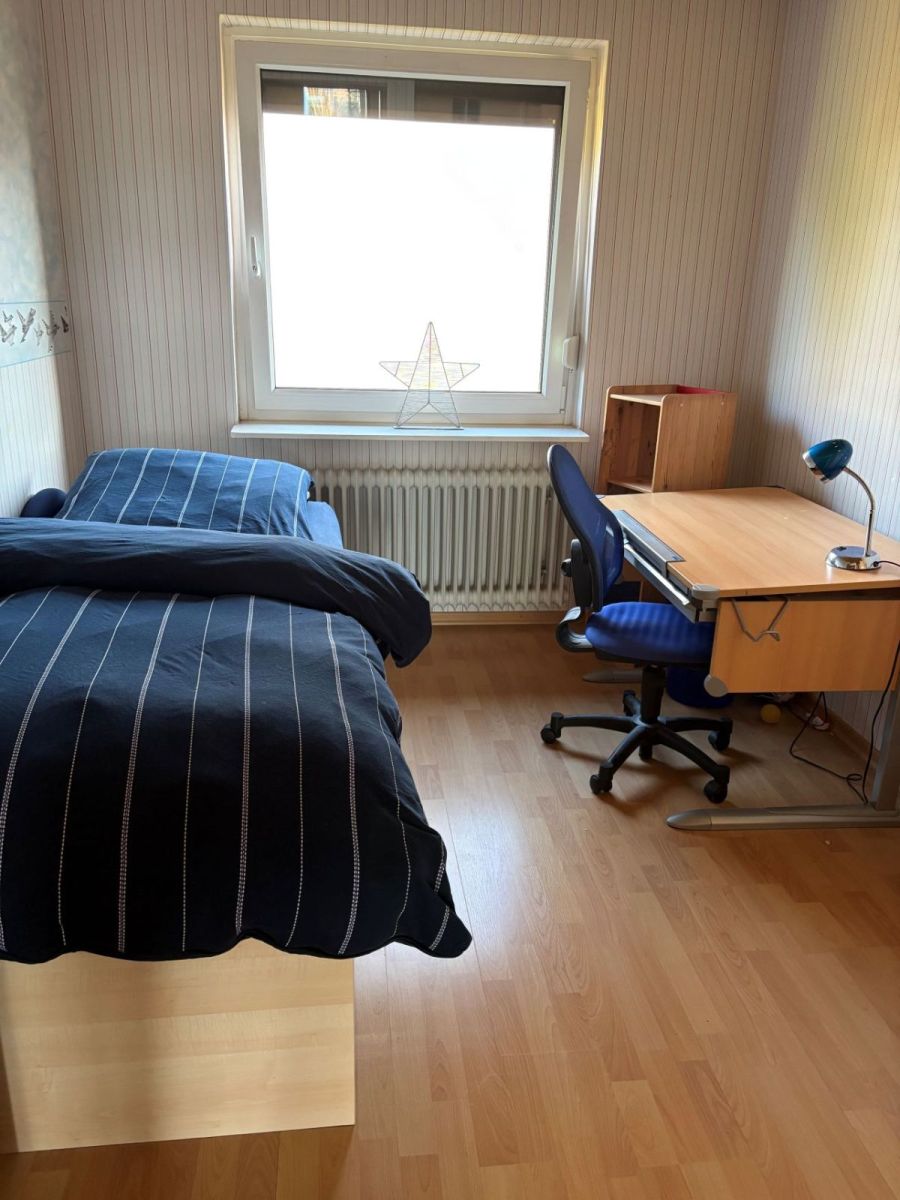 Herzstück des Hauses ist das herrliche, großzügige Wohnzimmer mit Echtholzparkett. In der Küche, im Gäste-WC mit Dusche sowie im Flur wurden einheitliche Fliesen verlegt. Vom Wohnzimmer aus gelangen Sie auf die große Terrasse zur Westseite, auf der Sie entspannte Stunden in der Abendsonne genießen können. Das Obergeschoss verfügt über zwei helle Kinderzimmer zur Westseite mit bodentiefen Fenstern und Zugang zum großen Balkon, der 2019 modernisiert wurde. Die Räume sind mit Laminatböden ausgestattet, das Bad ist hell gefliest. Alle Fenster verfügen über Außenrollläden; die Fenster auf der Westseite (Sonderanfertigung) wurden 2011 erneuert. Das Dachgeschoss wurde im Jahr 2007 ausgebaut und entsprechend gedämmt. Hier wurde Teppichboden verlegt sowie ein Dachflächenfenster mit Außenrollladen eingebaut. Neben dem großen Zimmer befindet sich ein zusätzlicher Abstellraum. Der Niedertemperaturheizkessel mit integriertem Buderus Öl-Blaubrenner wurde im Frühjahr 2007 eingebaut.