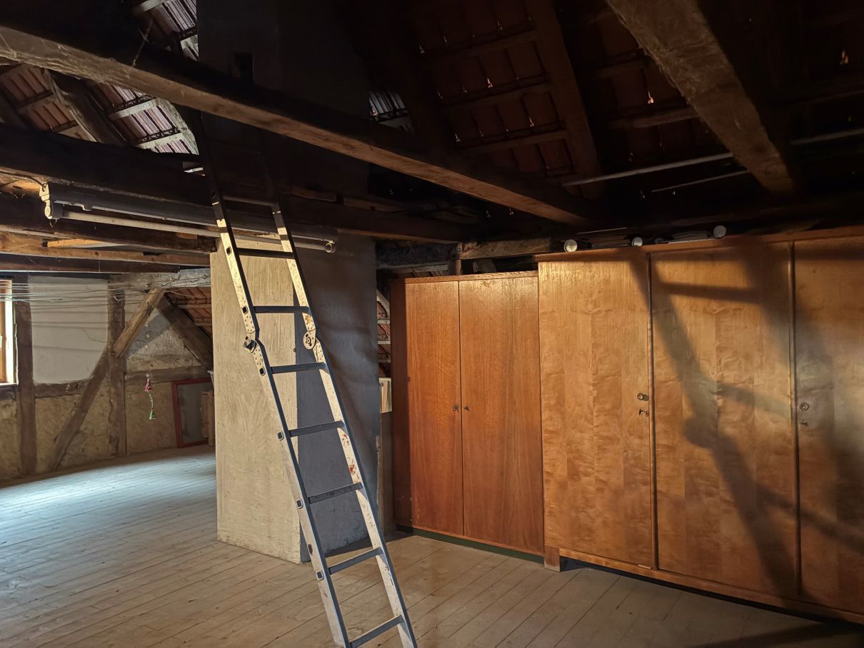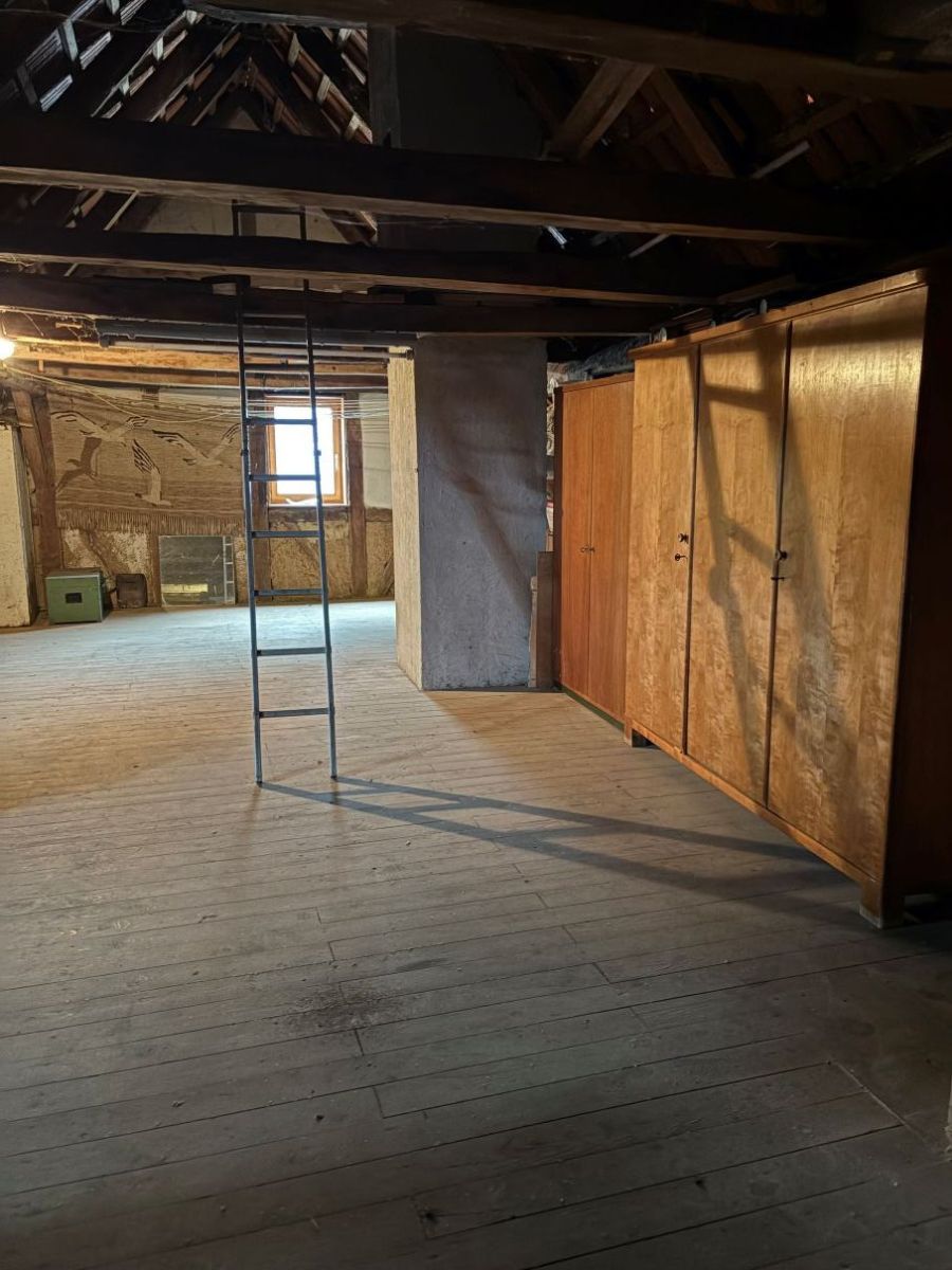Im Erdgeschoss liegt links vom Eingang das Esszimmer mit Platz für einen großen Esstisch. Der Kachelofen spendet wohlige Wärme – auch für die angrenzende Küche mit herrlichem Blick in den großen Garten und auf die Wiese mit dem alten Baumbestand. Rechts vom Eingang betreten Sie das großzügige Wohnzimmer mit herrlichen Eichenholzbalken. Auch hier sorgt ein Kachelofen für behagliche Temperaturen und Gemütlichkeit. Das Fachwerk an der Rückseite wurde verglast und schafft ein harmonisches Zusammenspiel dieses wunderschönen Raumes mit dem Garten dahinter und verbindet „Drinnen“ und „Draußen“ auf ganz wunderbare Weise. Eine Terrassentür ermöglicht Ihnen den direkten Zugang zum Garten. Das Obergeschoss bietet Ihnen zahlreiche Möglichkeiten, es nach Ihren Bedürfnissen aufzuteilen. Derzeit hat es rechts einen großen Wohn- und Schlafbereich mit Duschbad und kleiner Küche – ideal für Familien mit älteren Kindern oder Bewohner, die viel Besuch bekommen. Vom großzügigen Flur aus betreten Sie links das Schlafzimmer mit direktem Zugang zu dem großen Bad mit Dusche und Badewanne sowie einem schönen Waschtisch. Das Bad erreichen Sie auch vom Flur aus durch ein weiteres Zimmer. Angrenzend an dieses Zimmer gibt es einen weiteren Raum. Über eine Treppe gelangen Sie vom Obergeschoss in das Dachgeschoss. Es bietet eine große Ausbaureserve, sofern Sie diese benötigen. Die Geschossdecke ist gedämmt.